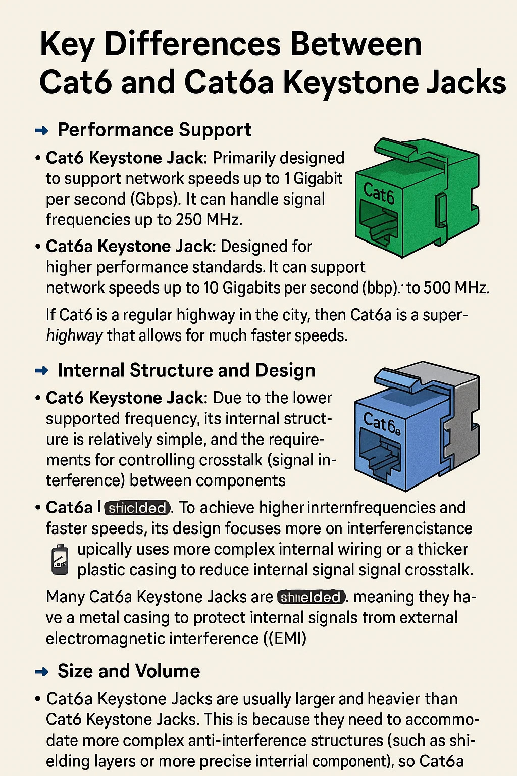 • Cat6a 키스톤 잭은 일반적으로 Cat6 키스톤 잭보다 **더 크고 무겁습니다**.