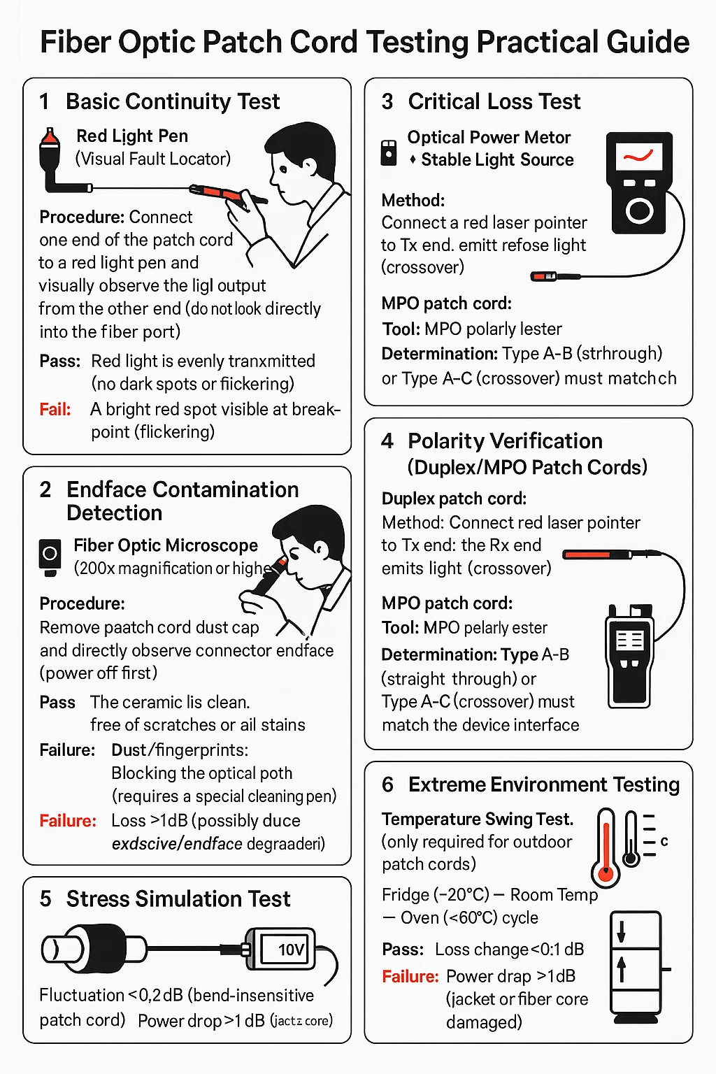 통과하다: Fluctuation ≤0.2dB (bend-insensitive patch cord). Failure: Power drop > 1dB (jacket or fiber core damaged).