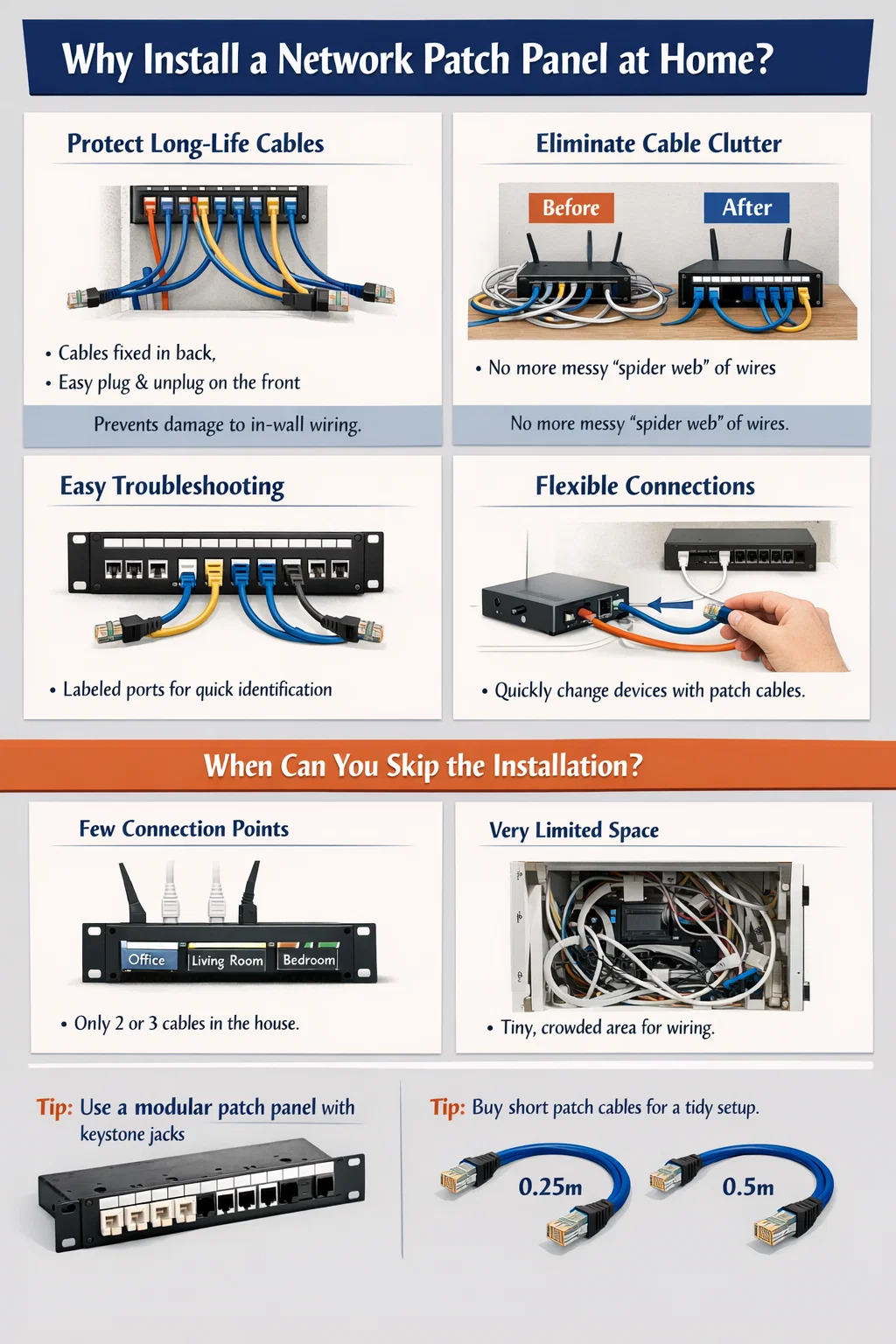 집 전체에 네트워크 케이블이 2~3개만 있는 경우 라우터 뒷면에 직접 연결하는 것이 훨씬 더 간단하고 패치 패널의 비용과 공간을 절약할 수 있습니다.