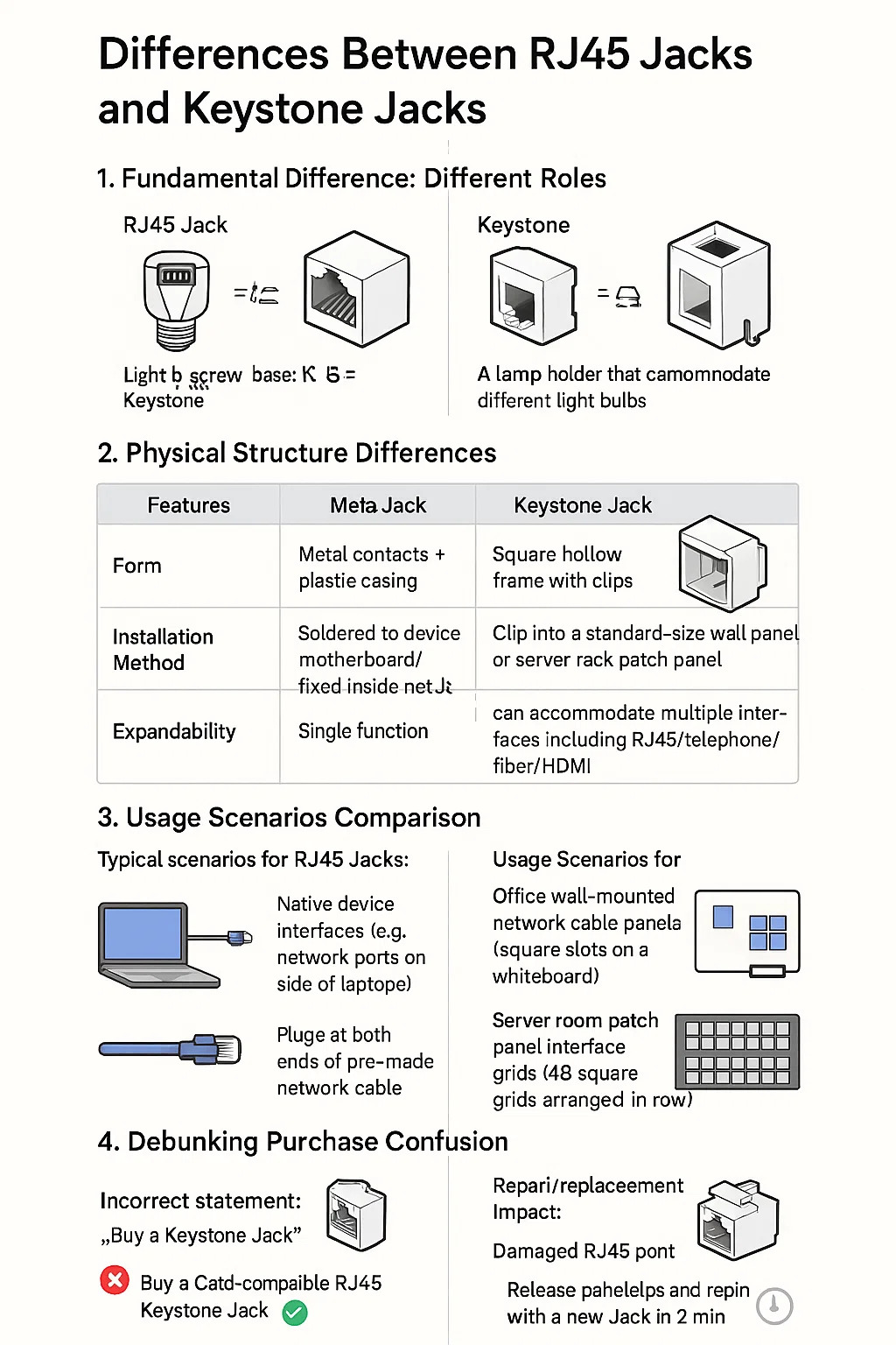비유: RJ45 = 전구의 나사 베이스; Keystone = 다양한 전구를 수용할 수 있는 램프 홀더.
