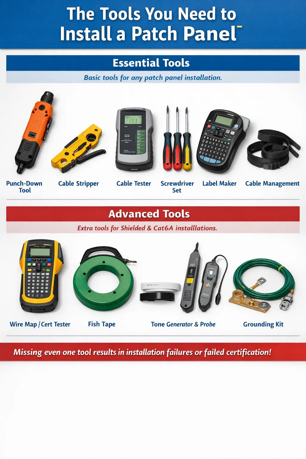 설치하려면 네트워크 패치 패널 , 펀치다운 도구, 케이블 스트리퍼, 케이블 테스터, 드라이버 세트, 라벨 메이커, 벨크로 스트랩이나 케이블 타이와 같은 케이블 관리 솔루션이 필요합니다. 더욱 까다로운 설치(특히 Cat6A 또는 차폐 케이블링)의 경우 와이어 맵 테스터 또는 전체 인증 테스터, 피시 테이프 또는 케이블 당김 그립, 프로브가 있는 톤 발생기도 필요합니다. 이는 선택적인 추가 기능이 아닙니다. 그 중 하나라도 누락되면 설치 실패, 인증되지 않은 채널 또는 몇 달 후에 표면화되는 유지 관리 문제가 발생합니다.